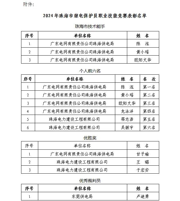 2025年1月13日,2024年珠海市继电保护员职业技能竞赛在珠海供电局新涌配电实训场举办。来自全市20家单位、60名选手报名参加竞赛。根据《2024年珠海市继电保护员职业技能竞赛项目实施方案》的工作安排,现决定对本次竞赛成绩优秀的选手、专家、工作人员及竞赛工作突出的单位给予表彰(名单见附件),以资鼓励。其中: