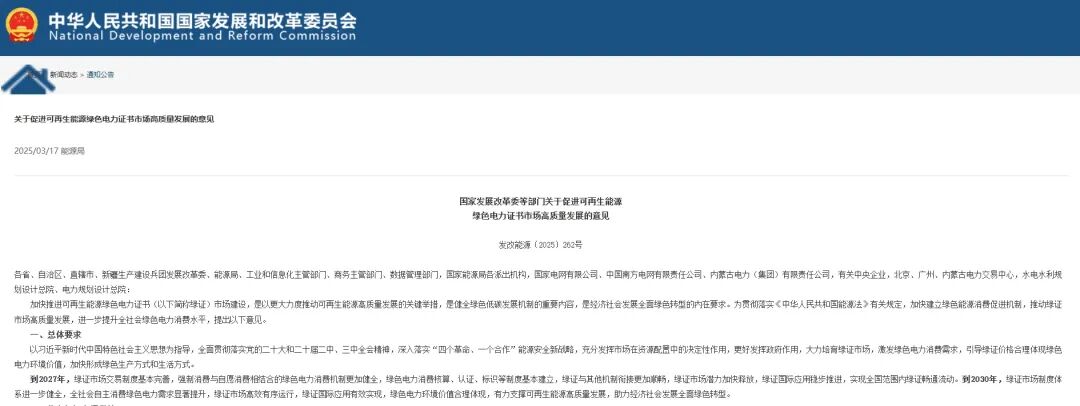 2025年3月17日,国家发展改革委、国家能源局等部门印发了《关于促进可再生能源绿色电力证书市场高质量发展的意见》。